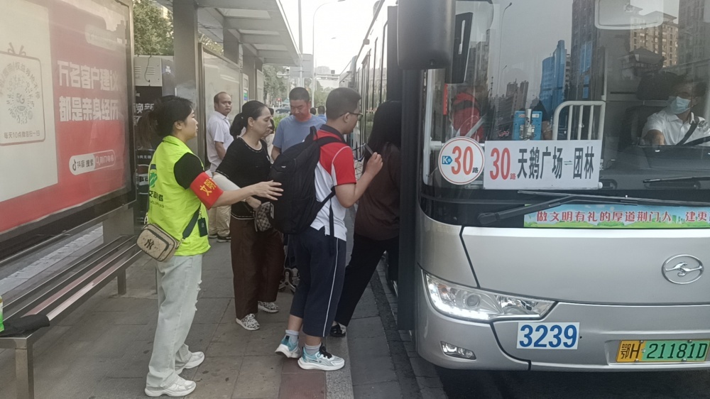 開(kāi)學(xué)當(dāng)天,人流大、車(chē)輛多,在城區(qū)各個(gè)學(xué)校附近,公交志愿者身穿綠馬甲或是佩戴安全袖章,守候在關(guān)鍵路口、站臺(tái)和斑馬線(xiàn),面帶笑容引導(dǎo)學(xué)生安全出行。